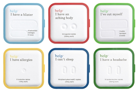 The medical industry, for example, is renowned for trying to mystify all of us with lots of information in very small type on leaflets and not giving us clear instructions about how to take their products. This approach, therefore, from http://www.helpinneed.com is really refreshing… it’s point of sale says simply “What’s Wrong?” and then the response is on the package. Simple, meaningful, clear messages, take a look below.