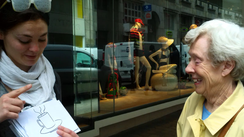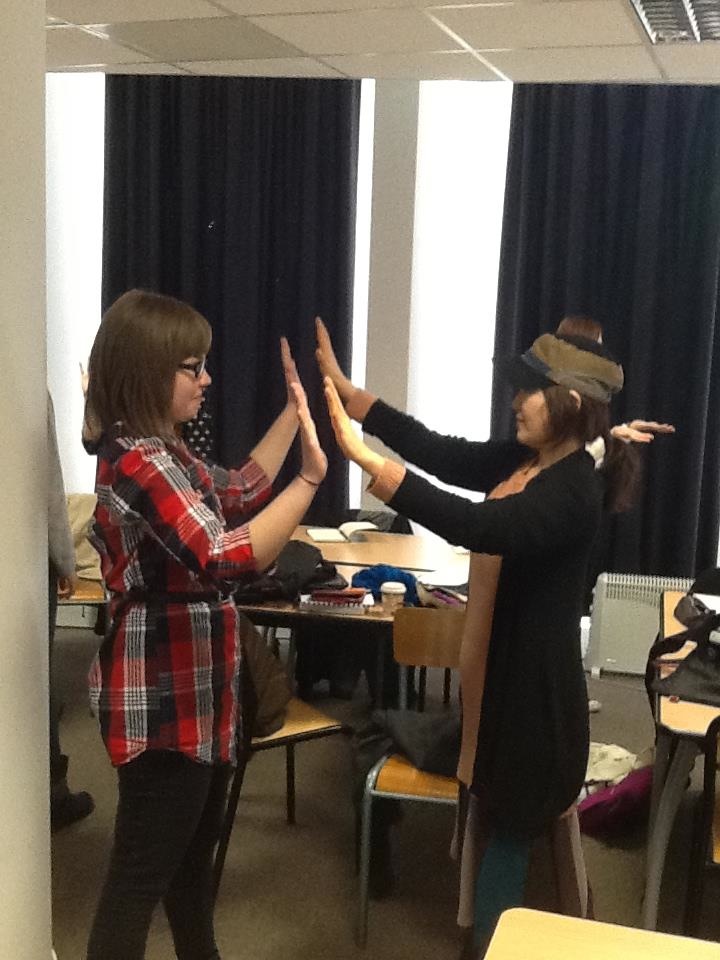 Before going to meet “older” people, the students had to think about how they could bring trust and confidence to the person they were meeting… one student arrived on crutches and in so doing, formed an immediate empathic experience with the older, less mobile person. One used mirroring techniques. The photograph below, shows a typical warm-up empathy exercise I undertake with students. Over 10 minutes they have to mirror each other very slowly, following each movement with precision. But this isn’t just about movements it’s about looking at people intensely. Noticing things that we don’t notice if we just scan a crowd, look at a group of people. Afterwards the students have to tell us how it felt, what they noticed, how the other person was etc. This can be done very simply, as we all know, when in a meeting by mirroring the person you are in the meeting with – changing position of your hands, your facial expressions, the way you sit, shows a sort of alignment with someone.