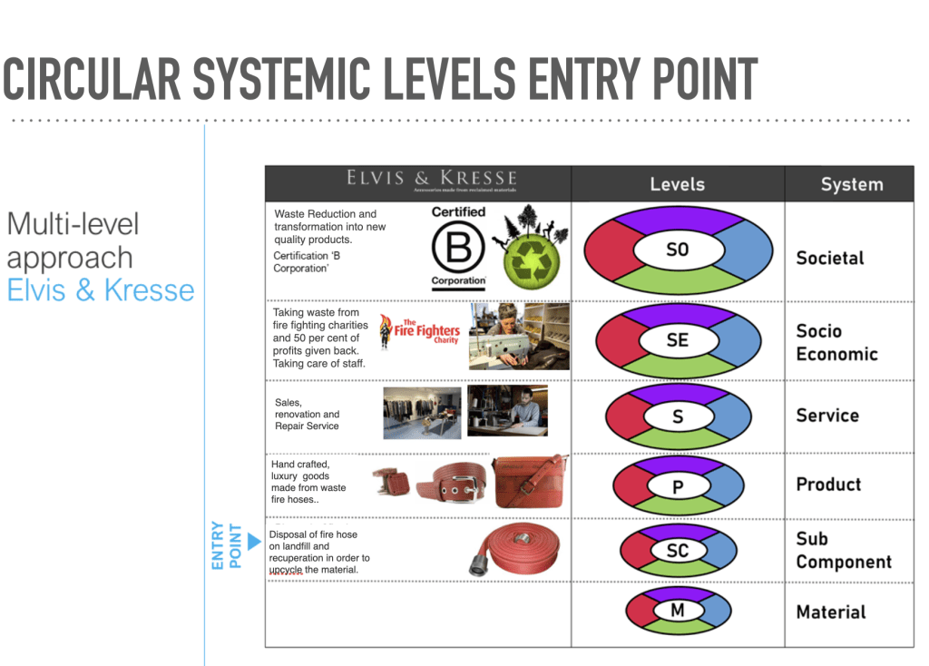 If we take a look at the Circular Systemic Levels entry point below, we can see that with this project, we eliminate having to create the material. We therefore save a lot of precious sustainable elements such as water, energy, transportation, materials etc. We enter at the ‘sub-component’ level where we can see the fire hose itself. We then see the transformation into products, services and the fact that the company then gives money back to the Fire Fighters who supply them with the raw materials. At the top, at the societal level, we see the other positive elements of this company having a certified B Corp Status etc.