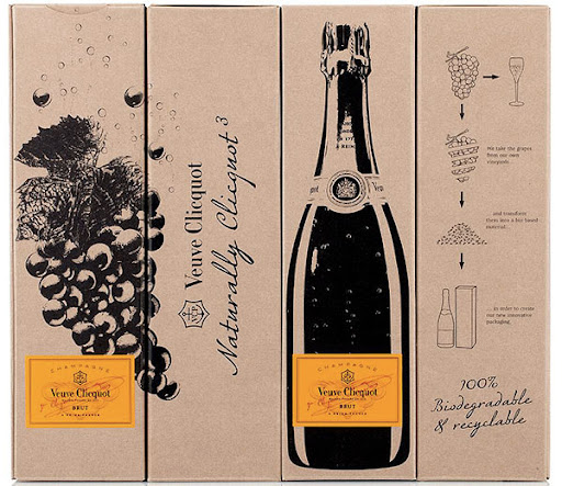 Veuvre Cliquot in the champagne industry, has been innovating with its own waste – grape skins, to produce packaging and ice coolers (made from potato starch). The champagne packaging not only uses the used grape skins, but also redesigns and renames its packaging based on its new sustainable values. “Naturally Cliquot”. Whereas its traditional packaging is printed in bright yellow all over, this pack is more descreet, using just black and white printing with a yellow sticker, making it more sustainable.