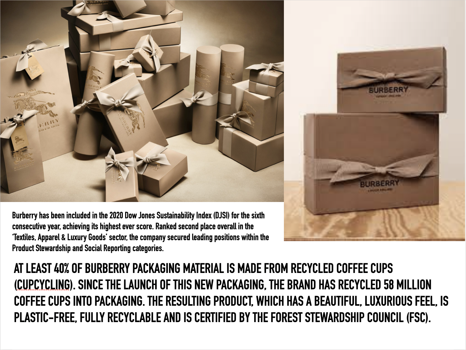 In addition, Burberry’s packaging uses 40 per cent of upcycled cups (this is called cupcycling). You can find out more about the process above in the video.