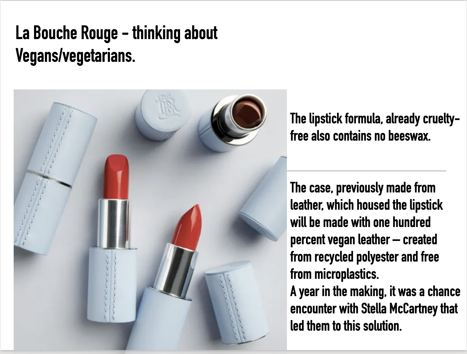 La Bouche Rouge, formed a collaboration with Stella McCartney to use its vegan leather on its lipsticks to complete it’s sustainable strategy to offer ranges of make-up whilst eliminating plastic and offering alternatives to vegan and vegetarian customers.