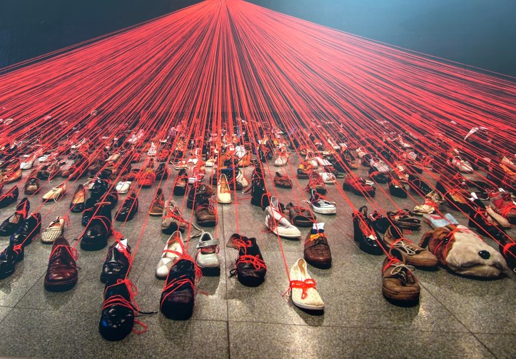 Featured image (top) Over the Continents: Chiharu Shiota a monumental installation using almost 4 miles of red yarn to tie the shoes together and connect them all at a single point. The notes invite visitors “to consider the life of an object” and “the fundamental ties that connect humans to one another.”